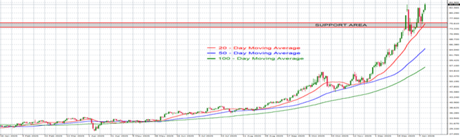 - CENA SREBRA JE DOSEGLA NOVI MAKSIMUM 12. JANUARA 2026. (84.567 USD). Cena srebra je dosegla novi maksimum od 84.567 dolara, što je potvrdilo snažan uzlazni trend od početka 2025. Zona između 76 i 74 dolara postala je nova zona podrške za srebro.