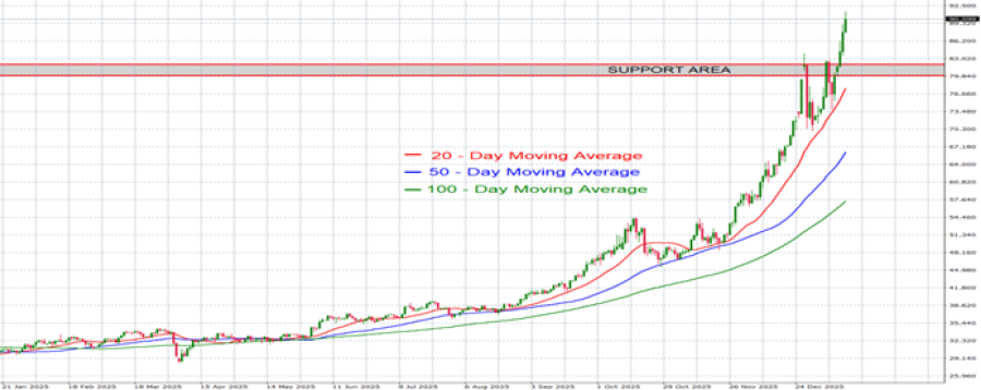 - CENA SREBRA JE DOSEGLA NOVI MAKSIMUM 12. JANUARA 2025. (91.488 USD). Cena srebra je dosegla novi maksimum od 91.488 dolara, što je potvrdilo snažan uzlazni trend od početka 2025. Zona između 80 i 82 dolara postala je nova zona podrške za srebro.