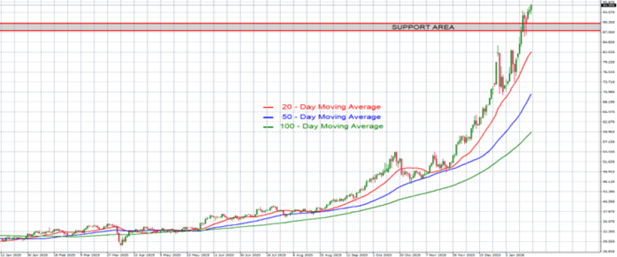 - CENA SREBRA JE DOSEGLA NOVI MAKSIMUM 20. JANUARA 2025. (95.450 USD). Cena srebra je dosegla novi maksimum od 95.450 dolara, što je potvrdilo snažan uzlazni trend od početka 2025. Zona između 90 i 88 dolara postala je nova zona podrške za srebro.