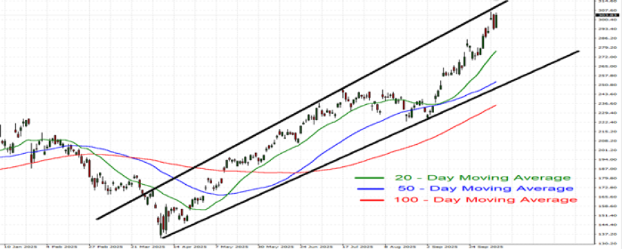 - Cena akcija kompanije je dosegla rekordnu vrednost od 306,56 dolara (6. oktobra 2025). Od početka 2025. cena akcija je porasla za oko 53%.