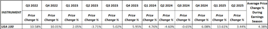 - STATISTIKA (POSLEDNJIH 12 KVARTALA): Cena indeksa USA100 prosečno je porasla za 4,38% tokom sezone kvartalnih izveštaja od početka AI ekspanzije u trećem kvartalu 2022. godine.