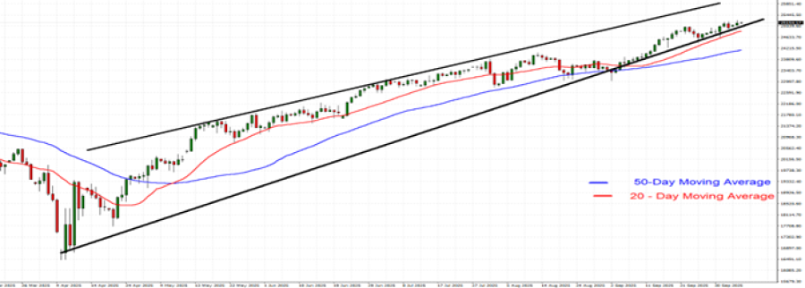 - UZLAZNI TREND OD APRILA 2025: Kao što je prikazano na donjem dnevnom grafikonu, USA100 nastavlja da se kreće iznad narandžaste uzlazne linije od aprila 2025, potvrđujući trend rasta. Međutim, i dalje postoji rizik od potencijalnog proboja ispod narandžaste linije ako se promene tržišni uslovi.