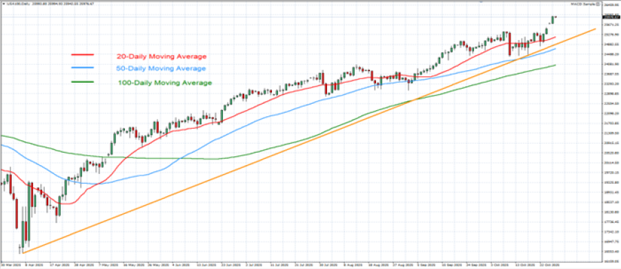 - DNEVNI POKRETNI PROSECI: USA100 ostaje iznad 20-, 50- i 100-dnevnih pokretnih proseka, što ukazuje na pozitivan trend. Međutim, USA100 bi takođe mogao da promeni trend ako padne ispod tih proseka.