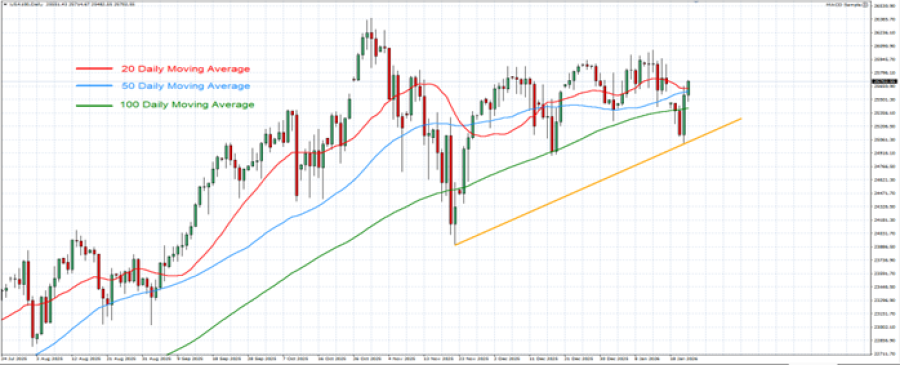 - DOGAĐAJ (SREDA, 21. JANUAR, 13:30 GMT): TRAMPOV GOVOR U DAVOSU PRUŽIO JE SNAŽNU POTPORU AMERIČKIM TRŽIŠTIMA AKCIJA. Tramp je održao govor u kojem je izneo stav o podršci privrednom rastu, pohvalio američku privredu i ublažio kratkoročne geopolitičke zabrinutosti isključujući upotrebu sile na Grenlandu. Takođe je ojačao očekivanja o kamatnim stopama otpornijim na rast i snažno podržao američko vođstvo u veštačkoj inteligenciji, gradeći poverenje ulagača i pružajući pozitivnu podršku visokotehnološkom USA100 indeksu.