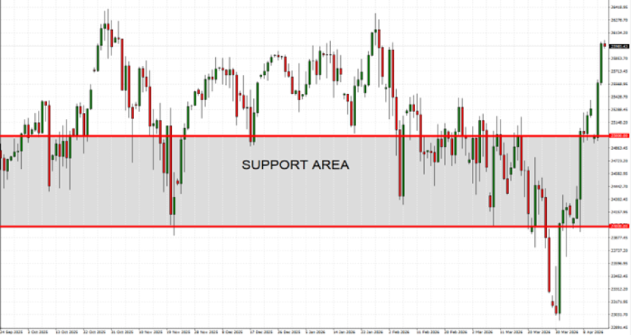- PODRŠKA: 25.000-24.000. Nakon porasta od više od 7% nakon što je američki predsednik Tramp najavio dvosedmični prekid vatre u ratu na Bliskom Istoku, USA100 je sada ponovo porastao iznad nivoa od 24.000-25,000, koji deluje kao zona podrške od 4. tromesečja 2025.