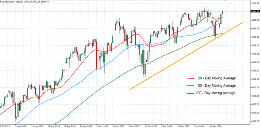 TREND RASTA OD NOVEMBRA 2025: USA500 ostaje iznad narandžaste uzlazne linije od novembra 2025, potvrđujući pozitivan trend.