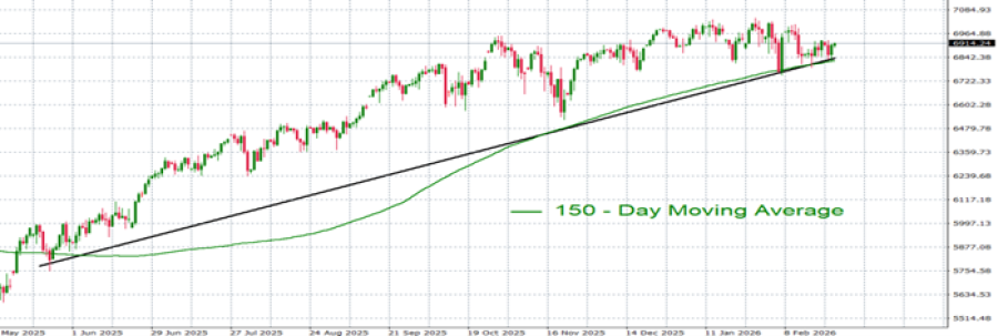 - UZLAZNI TREND OD MAJA 2025: USA500 je ostao iznad crne linije uzlaznog trenda od maja 2025. Ova linija igrala je ulogu podrške i potvrđivala uzlazni trend. Indeks se takođe kretao iznad pokretnog proseka podešenog na 150 dana što potvrđuje srednjeročni uzlazni trend. Međutim, USA500 takođe može promeniti trend ukoliko se cene probiju ispod ovih nivoa.