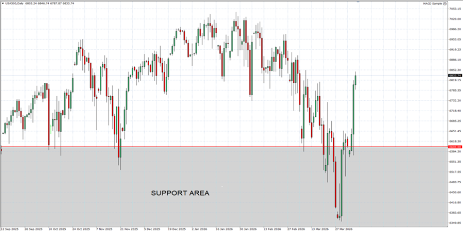 - PODRŠKA: 6600. Nakon porasta od više od 2.5% nakon što je američki predsednik Tramp najavio dvosedmični prekid vatre u ratu na Bliskom Istoku, USA500 je sada ponovo porastao iznad nivoa od 6,600, koji deluje kao zona podrške od septembra 2025.