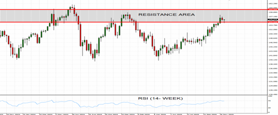 - JAK OTPOR: 160-155. Ovo područje deluje kao glavni otpor od aprila 2024. U poslednjih godinu i po dana, par USDJPY je testirao ovo područje tri puta.