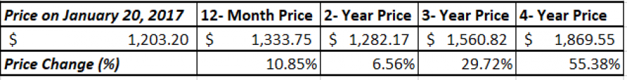 - STATISTIKA: ZLATO JE PORASLO ZA 21,44% U PRVOJ GODINI TRAMPOVOG MANDATA (20. JANUARA 2017 - 20. JANUARA 2018). Osim toga, zlato je poraslo za 55,38% za celi prvi predsednički mandat Donalda Trampa (20. januara 2017 - 20. januara 2021).
