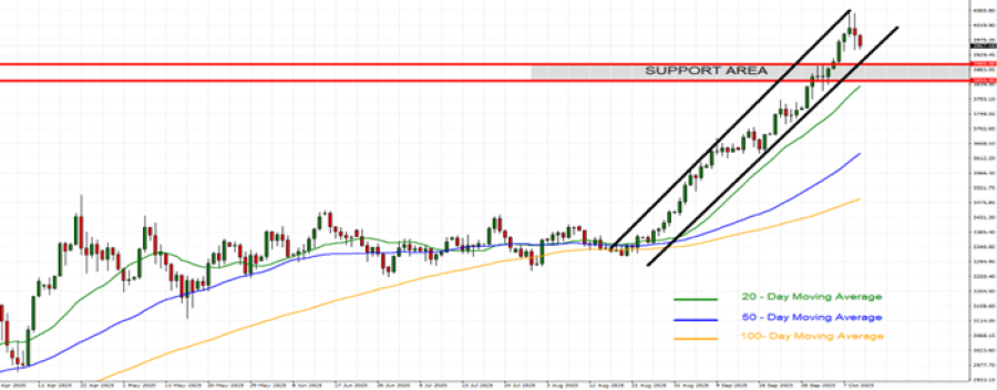 - Podrška: 3,900 - 3,850 USD. Nakon što su dosegle nove istorijske maksimume (4.059,02 USD), cene zlata nedavno su pale ispod 4.000 USD, ali su još uvek iznad zone podrške od 3.900 do 3.850 USD. Međutim, i dalje postoji rizik od potencijalnog proboja ispod te razine ako se promene tržišni uslovi.