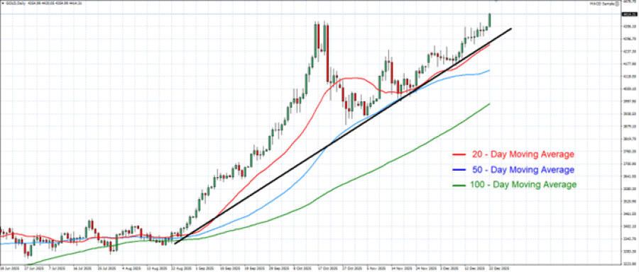 - UTORAK, 23. DECEMBRA U 15:00 GMT: INDEKS POVERENJA POTROŠAČA CENTRALNU BANKU SAD (DECEMBAR). Investitori s nestrpljenjem čekaju podatke za decembar, imajući u vidu da je izveštaj iz novembra razočarao, pokazao je 88,7 (u odnosu na očekivanih 93,5). Podaci u novembru su pokazali najnižu stopu od aprila 2025. Ako podaci za treći kvartal budu niži nego što se očekivalo, cena zlata bi mogla da dobije određenu podršku u vidu rasta.