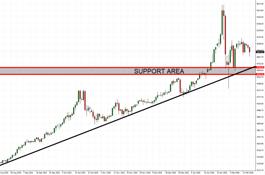 - ZONA PODRŠKE: 4700 - 4600. Nakon poslednje korekcije cena koja se dogodila krajem januara 2026, cene zlata pronašle su zonu podrške u rasponu od 4,700 do 4,600 dolara. Međutim, cena bi takođe mogla da se smanji.
